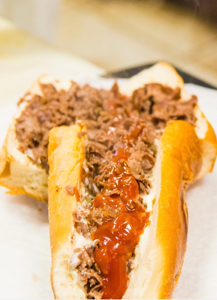 shredded steak with green peppers, onions, mozzarella cheese and sauce