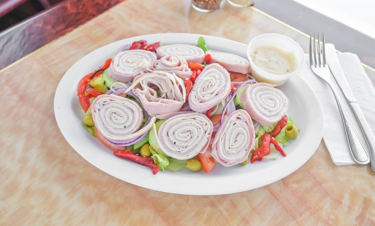 turkey, ham, american cheese, roasted peppers, lettuce,tomatoes,red onion,green olives, cucumbers