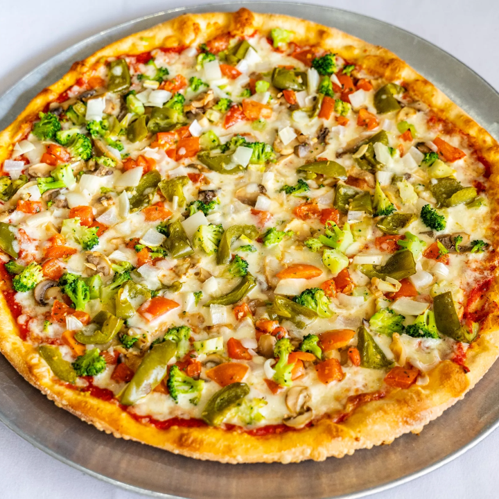broccoli, fried onions, green peppers, mushrooms and spinach with mozzarella and cheddar cheese