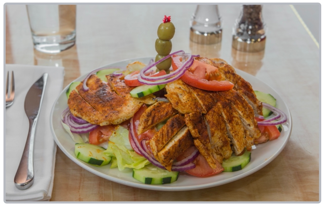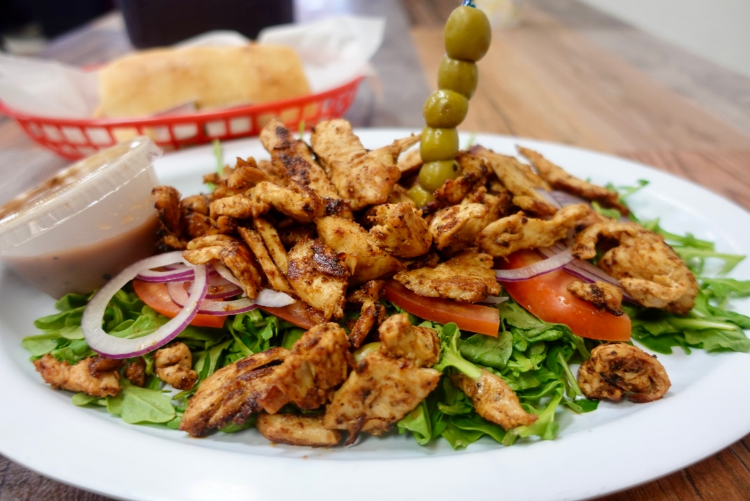 blackened chicken, arugula, tomatoes, red onions, green olives