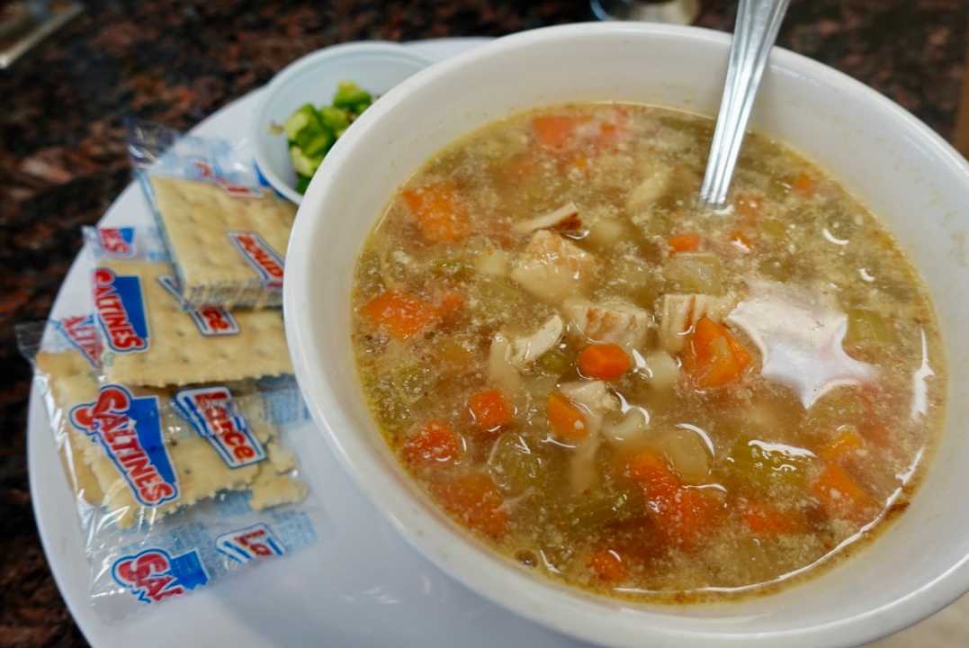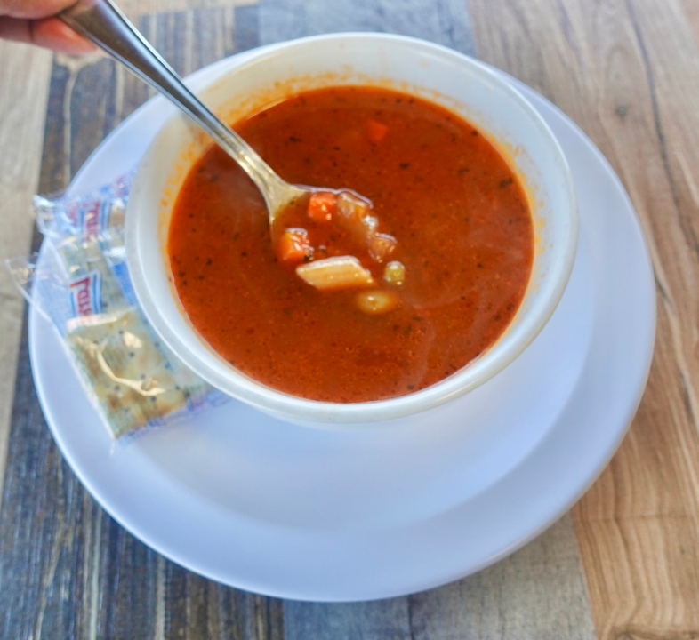 White kidney beans, carrots, celery, ditalini pasta in a red broth