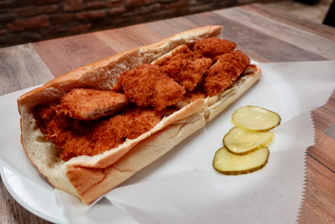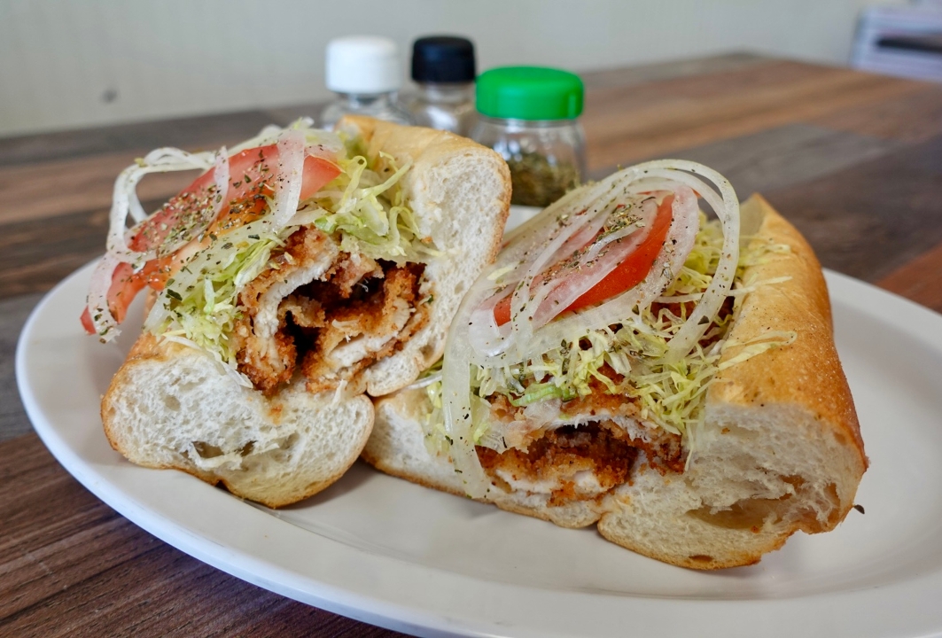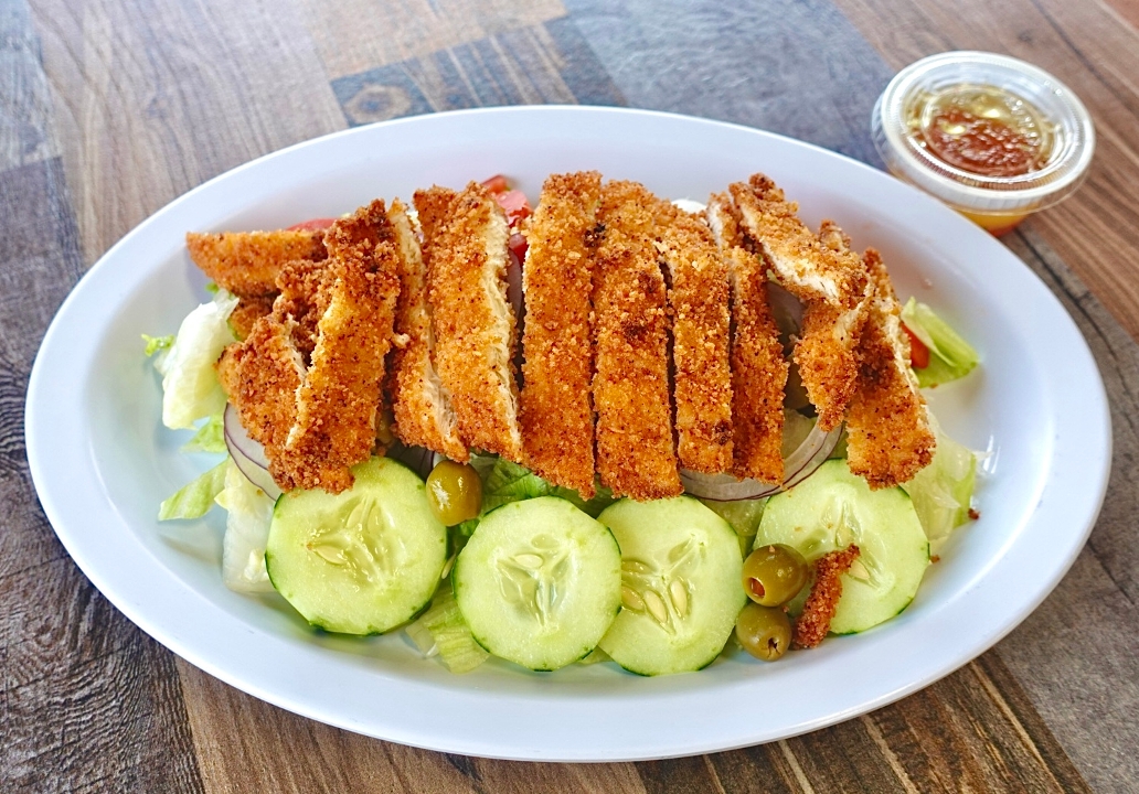 breaded chicken, lettuce, tomato, raw onions