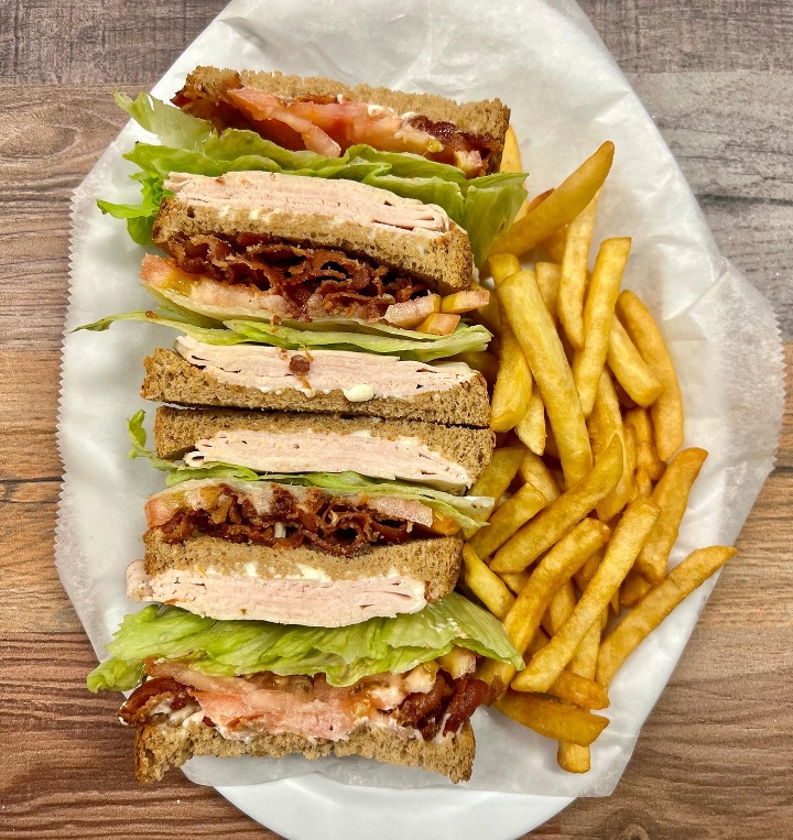 american cheese, lettuce, tomatoes, onions, pickles. served with fries.